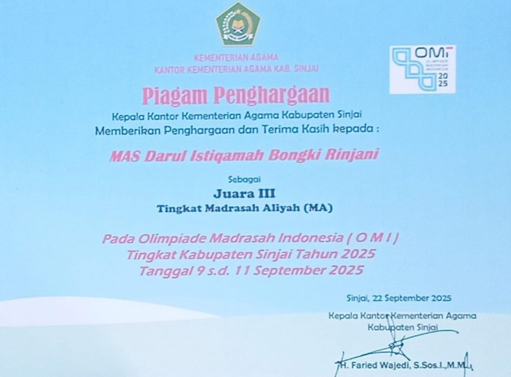Bulukumba (Humas Darismah)-MAS Darul Istiqamah Bongki Rinjani menorehkan prestasi membanggakan dengan meraih Juara III Olimpiade Madrasah Ilmu (OMI) Tingkat Kabupaten Sinjai.
